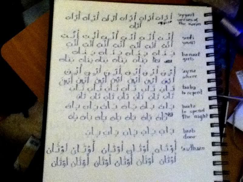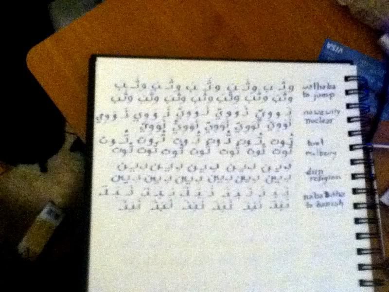 Feb. 19th, 2012 12:24 pmThere. Arabic accounting here and here since it didn't get done yesterday on account of movie of mind screw. And at some point I need to go through my iSis and delete all the old pictures of Arabic, since I don't exactly need them anymore. I think my handwriting is getting a little better anyway! And my consistency at recognizing letters. Stupid new alphabets.